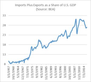 Imports + Exports as a Share of US GDP Posted March 31, 2017 Imports + Exports As Share of U.S. GDP Previous Post Next Post